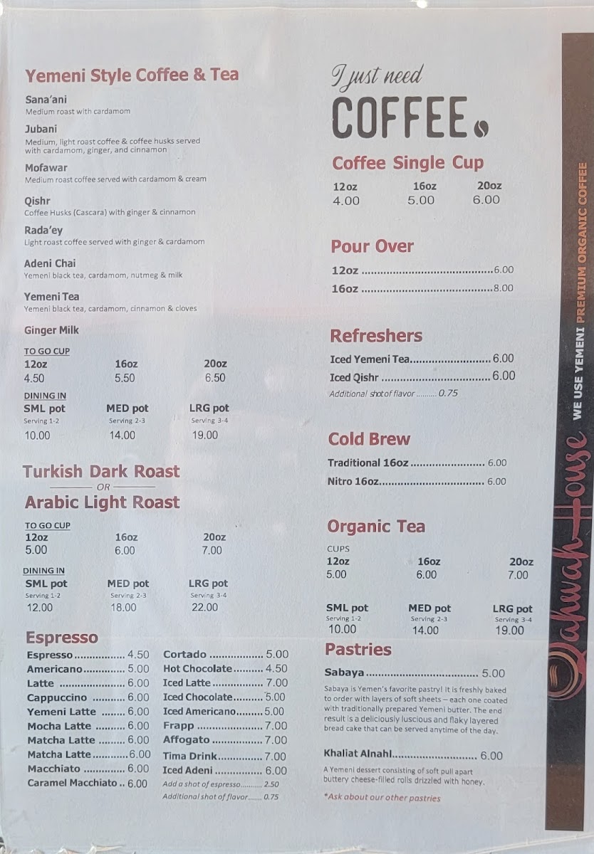 Double shot espresso, milk yemeni spices (ginger, cinnamon, cardamom).
